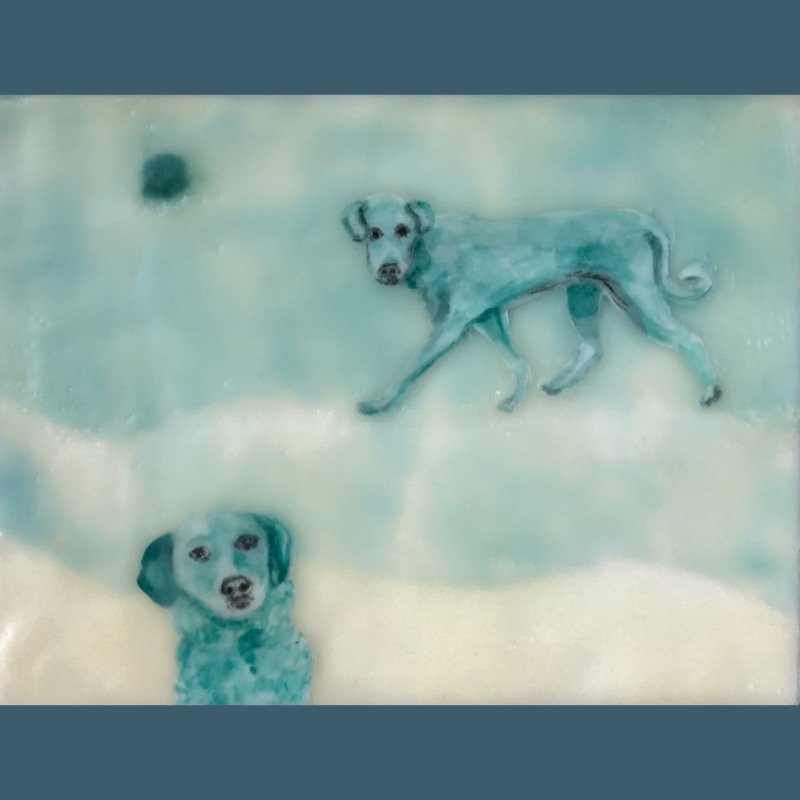 “Blue Dogs” (encaustic painting), by Nancy Whitcomb, a member of New England Wax.