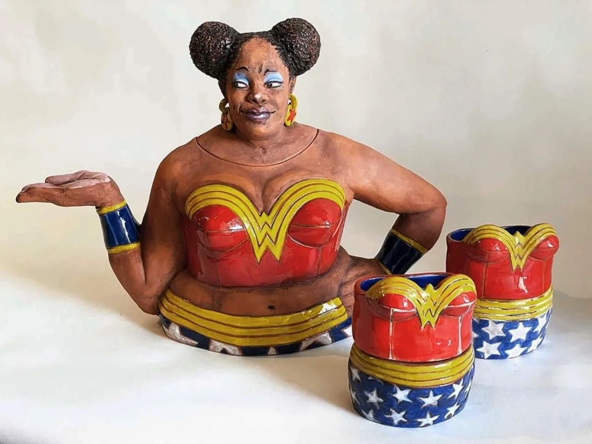 “Wondergrrrl Teapot’’ (cast terracotta, underglazes, glazes), by Sarah Peters, in her show with Don Nakamura, titled “Bold Women and Vivid Dreams,’’ at the Cahoon Museum of American Art, Cotuit, Mass., through June 2.