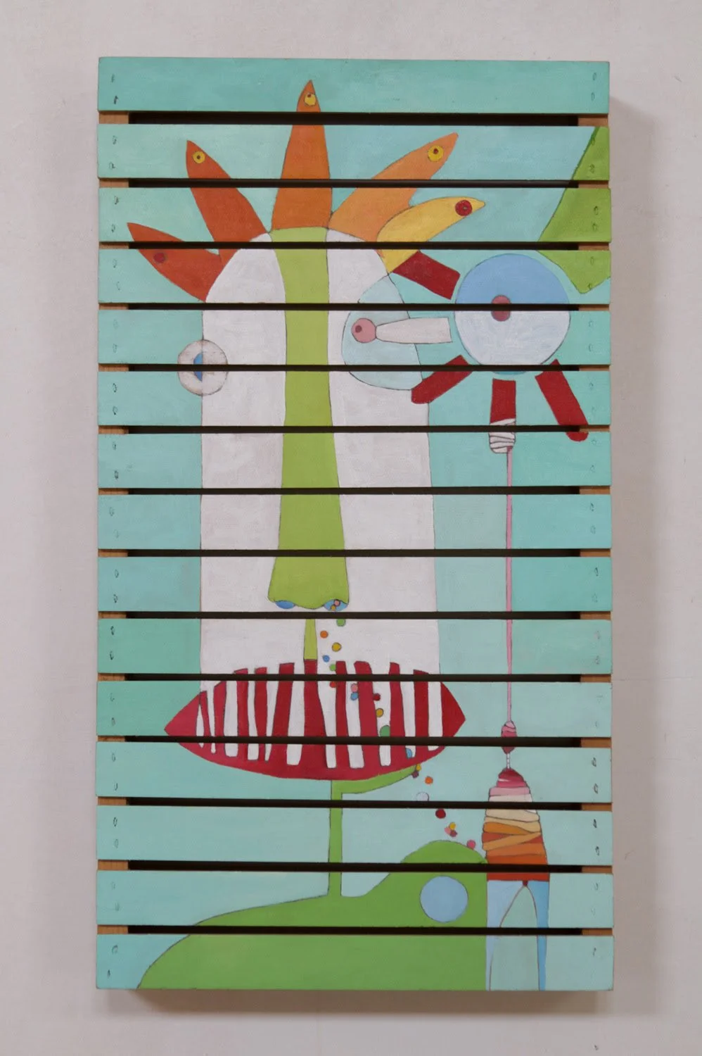 “Hanging By a Thread” (acrylic paint and graphite on wood panel), by Royalton, Vt.-based artist Amy Schachter, in her show “Hiding in Plain Sight,’’ at Studio Place Arts, Barre, Vt., through April 20.