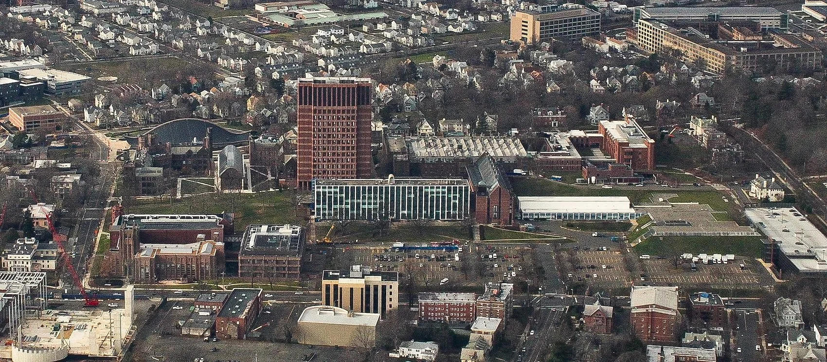 Yale University’s Science Hill, in New Haven. The area is primarily devoted to the physical and biological sciences. The old Winchester Repeating Arms Factory is at top right. (Connecticut for many years was a major firearms maker.)