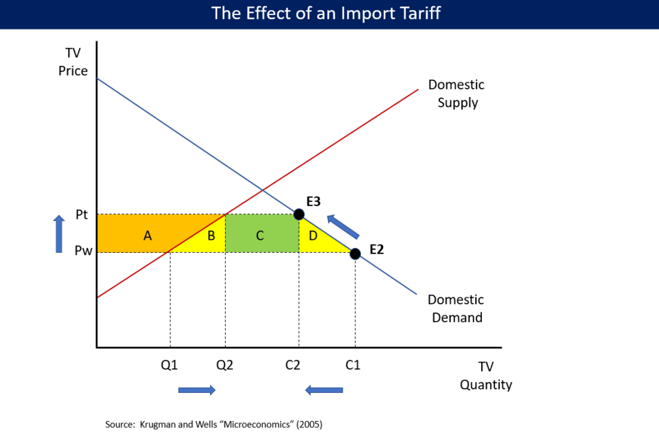 Effects of an import tariff, which hurts domestic consumers more than domestic producers are helped. Higher prices and lower quantities reduce consumer surplus by areas A+B+C+D, while expanding producer surplus by A and government revenue by C. Areas B and D are dead-weight losses, surplus lost by consumers and overall.