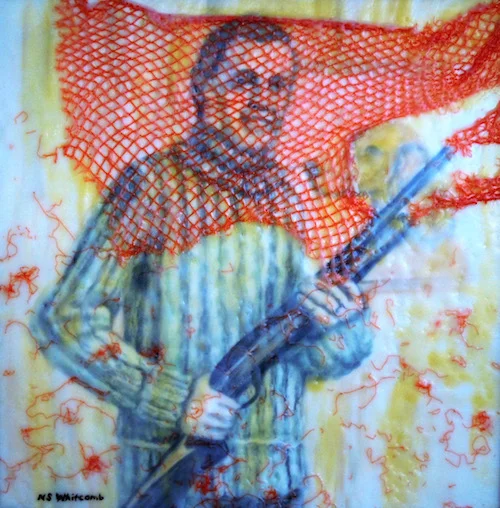 "Hunter's knitting pattern'' (encaustic), by Nancy Spears Whitcomb.