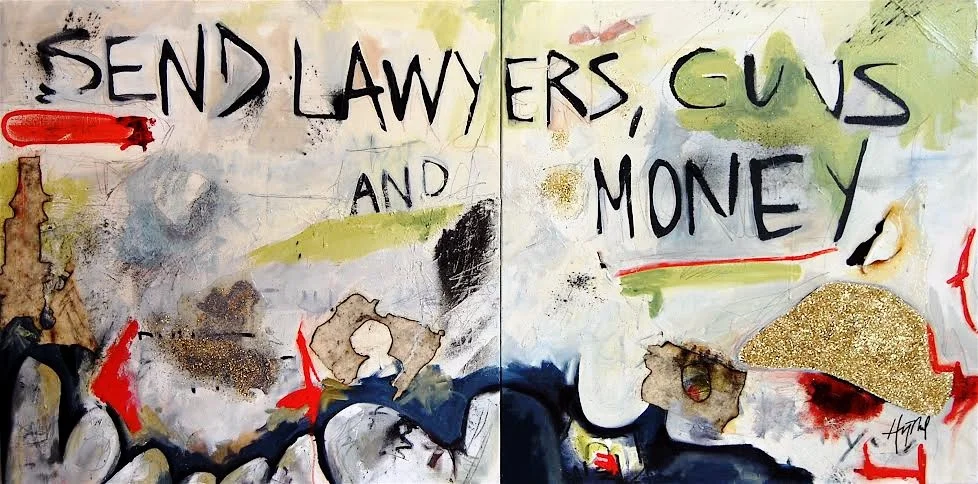 "Send Lawyers, Guns and Money - Warren Zevon" (oil, charcoal, graphite, pastel, collage and glitter on canvas), by Hilary Tait Norod, showing at Christopher's Restaurant, Cambridge, Mass.