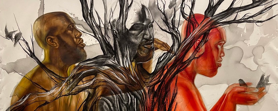 “A Conversation with Sparrows” (oil paint, india ink and charcoal on unstretched canvas), by Imo Nse Imeh, in the group show “The Miracle Machine: A Black Artists Think Tank ,’’ through Dec. 8, at the Augusta Savage Gallery, at the University of Massachusetts at Amherst.