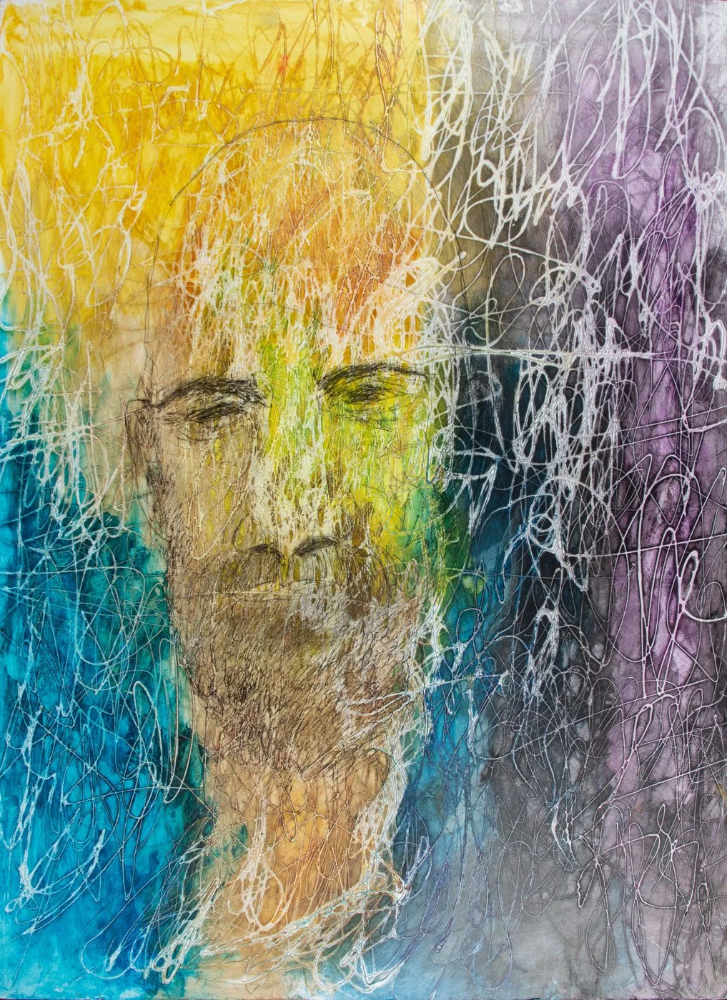 “Considering the Course of Events’’ (acrylic, ink and graphite), by Chestnut Hill-based artist Norman Finn, in his show “Faces Along the Way: Real and Imaginary,’’ at Galatea Fine Art, Boston, June 20-July 2.