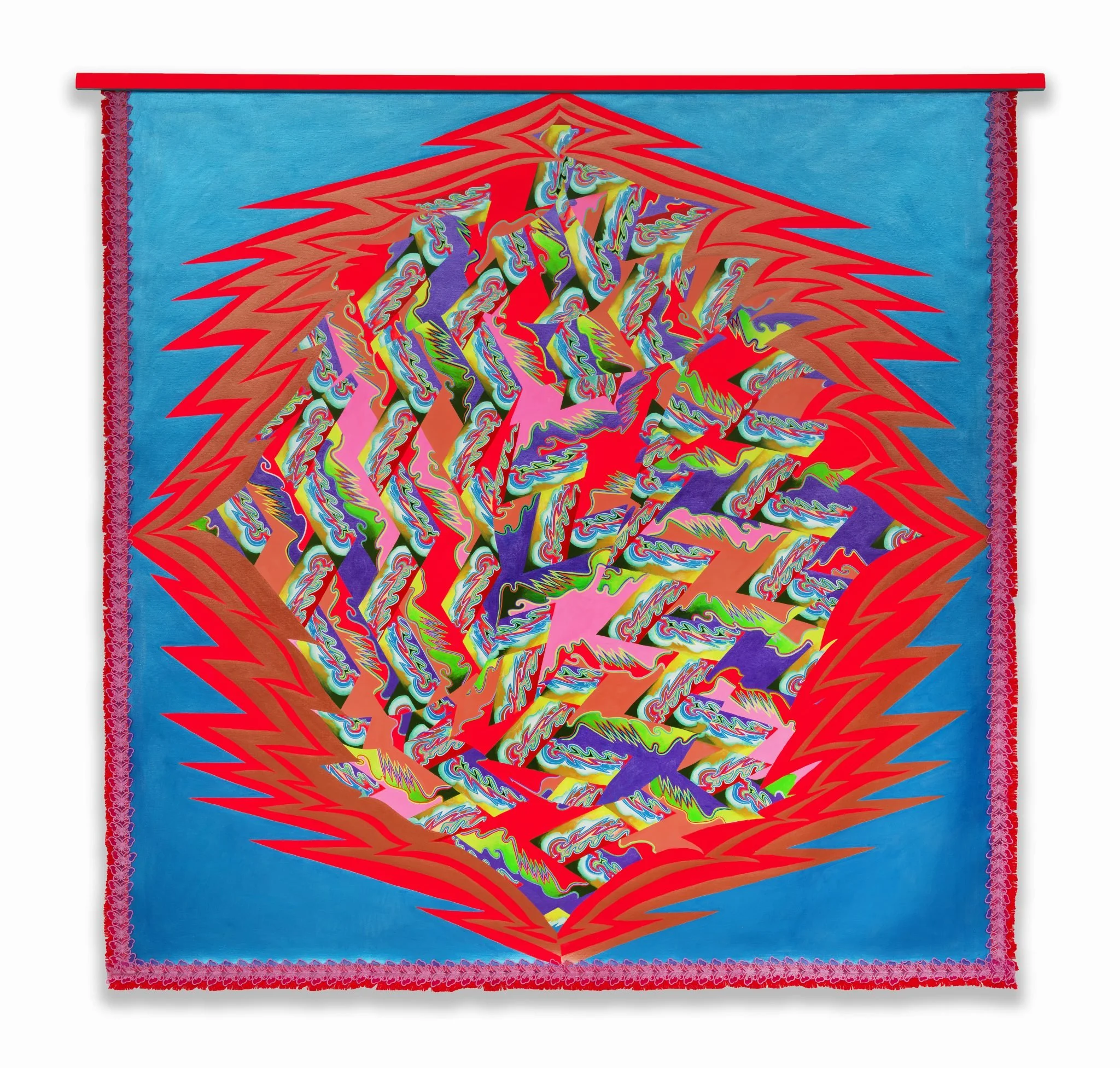 “Lisa Alvarado’s free-hanging paintings expand into the realms of installation, textile, sound and performance. Working in acrylic on unstretched canvas, Alvarado creates meditative, patterned works that evoke Mesoamerican weavings and other non-Western traditions of abstraction. In ‘Lisa Alvarado / MATRIX 192 / Spinning Echo,’ the Chicago-based, San Antonio-born artist transforms the gallery with an installation of new paintings, sound, and site-specific floor sculptures, creating an immersive multisensory experience of what the artist calls her ‘vibrational aesthetic.”’