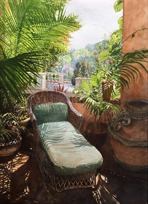 ”Terrace Oasis” (watercolor), by West Barnstable, Mass.-based Brenda Bechtel, at the New England Watercolor Society Gallery’s 2023 “Celebrating New England’’ show, at the gallery, in Plymouth, Mass., through Sept. 7.