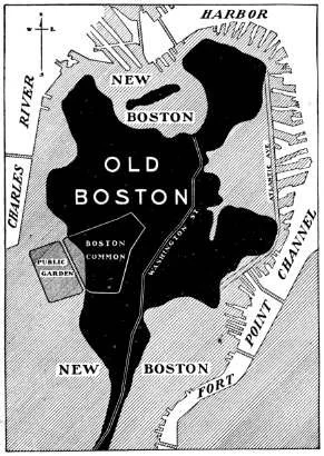 This shows the original dimension of the Shawmut Peninsula, on which Boston was first built, staring in 1630. The gray areas marked with the words "New Boston" are the product of the period of filling in mudflats that began in 1803.