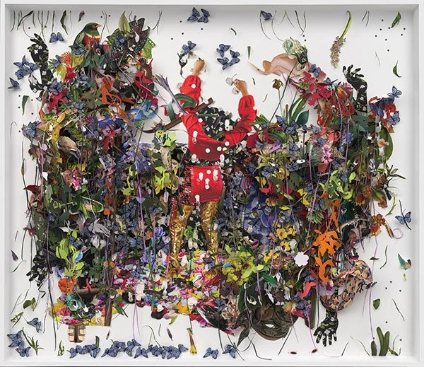 …"there is a rumble as the garden folds, rolls, shreds, devours…itself’’ (digital print on archival watercolor paper with hand-cut and torn elements, construction paper, plastic, feathers mounted on artist designed wallpaper), by Ebony G. Patterson, in the show “In the Garden,’’ at The Current Gallery, Stowe, Vt., through April 11.