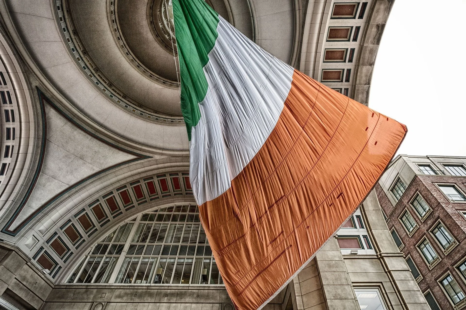 An Irish flag, said to be the world’s biggest, hanging outside the Boston Harbor Hotel.
