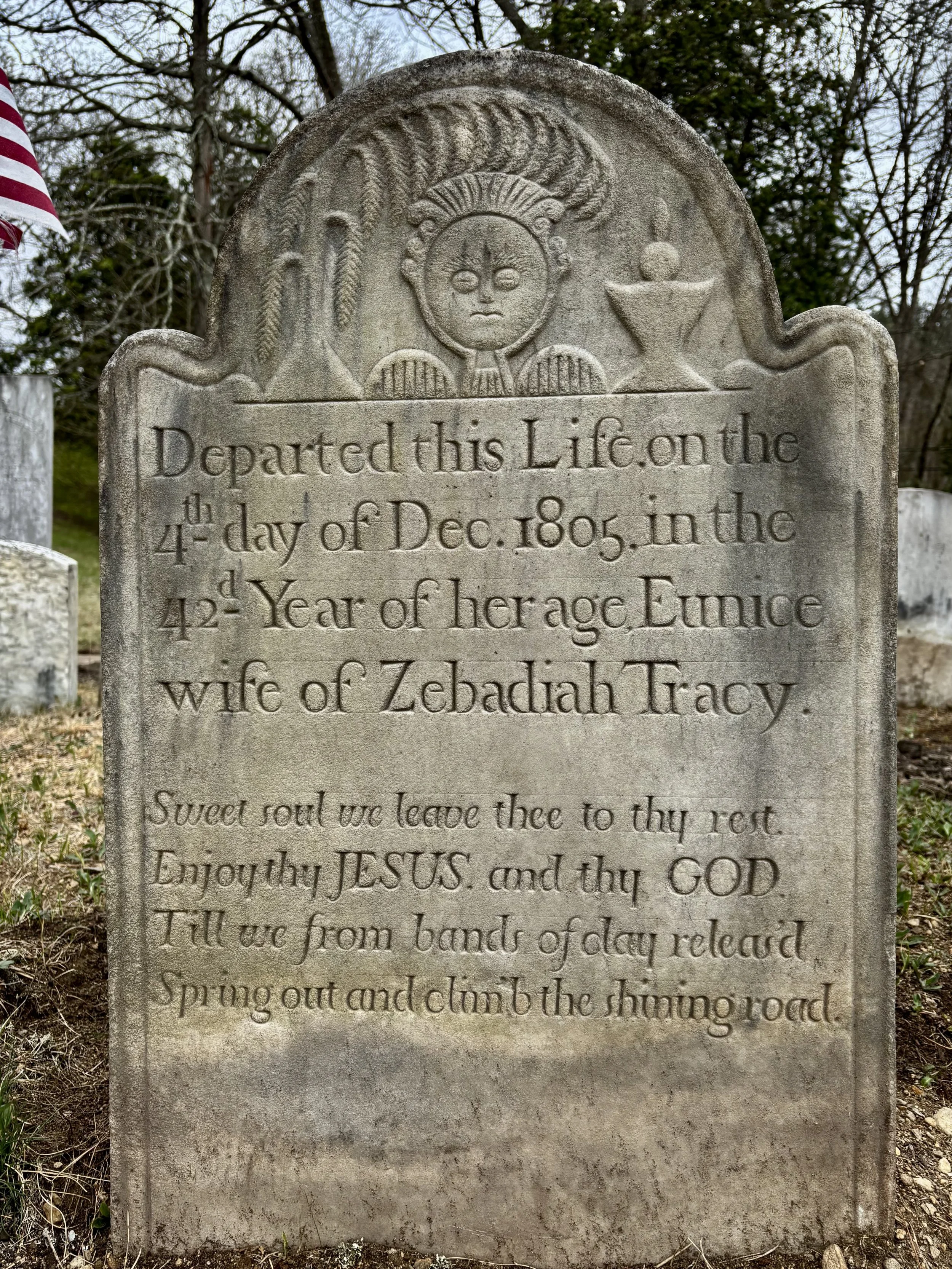 The government-issue marble stones are the exception in Old Scotland. Most of the dead here lie beneath sandstone, a rarity when one recalls the typical slate steles of 18th-Century New England. Scotland had more than one artisanal stone carver. Joseph Manning and his sons Rockwell and Frederick contributed tombstones to the area for over six decades. It was John Walden, however, who provided Scotland with unique round faces.