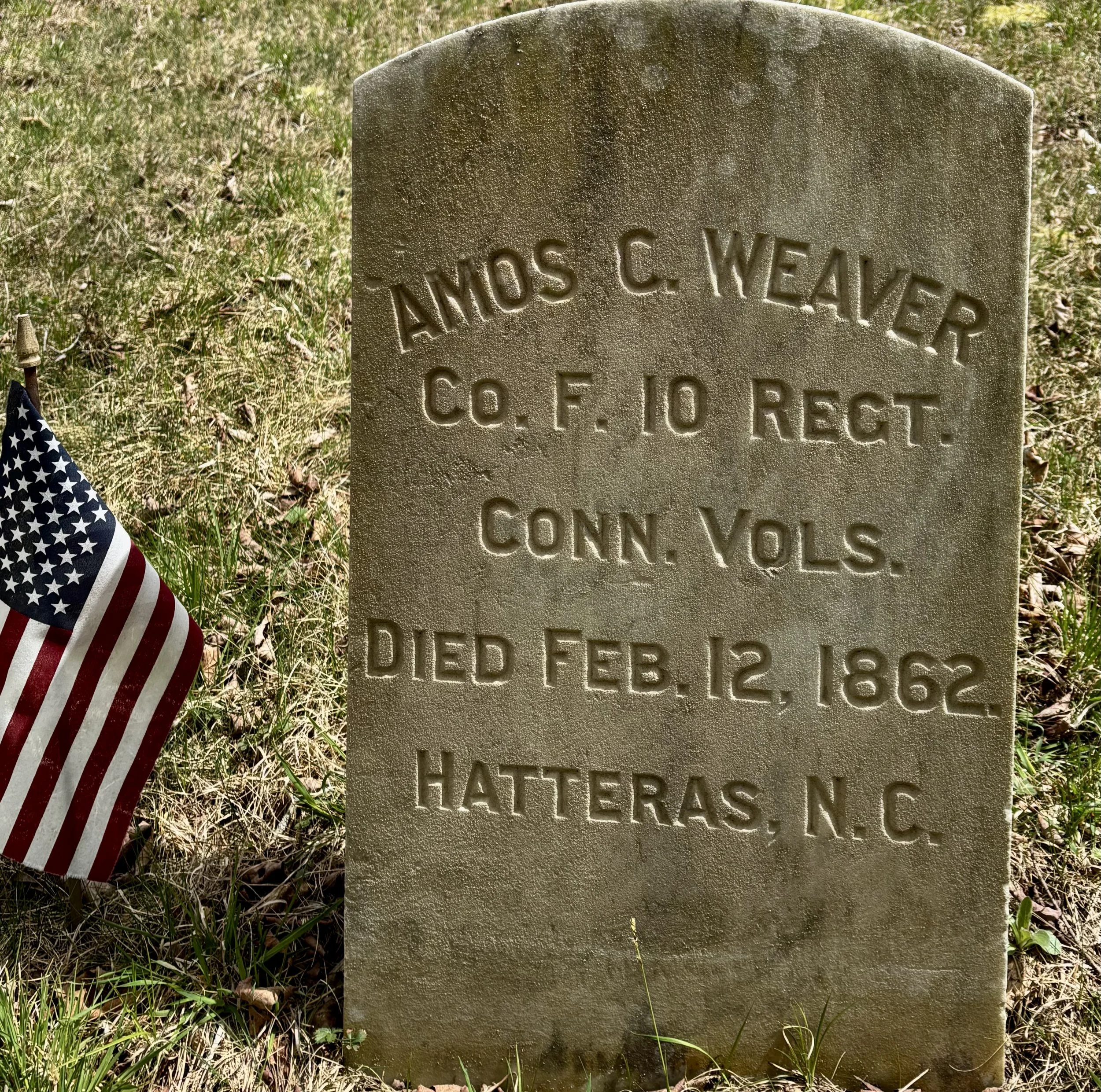 During the first half of 1862, Union General (and Rhode Islander) Ambrose Burnside, employing New England regiments, tried to shut down Confederate blockade-running operations along the Outer Banks. Amos Weaver was presumably wounded in the Battle for Roanoke Island, dying of his wounds five days later.