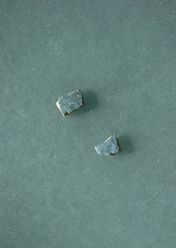 The show displays “large, greenish-blue resin panels embedded with family photographs, spiritual charts, and historical documents. The work explores themes of lineage, memory and geopolitical histories, reflecting personal and collective identities shaped by migration, cultural traditions and archival storytelling. The image below reflects small, irregularly shaped blue ceramic fragments resting on a textured greenish surface, casting soft shadows.’'