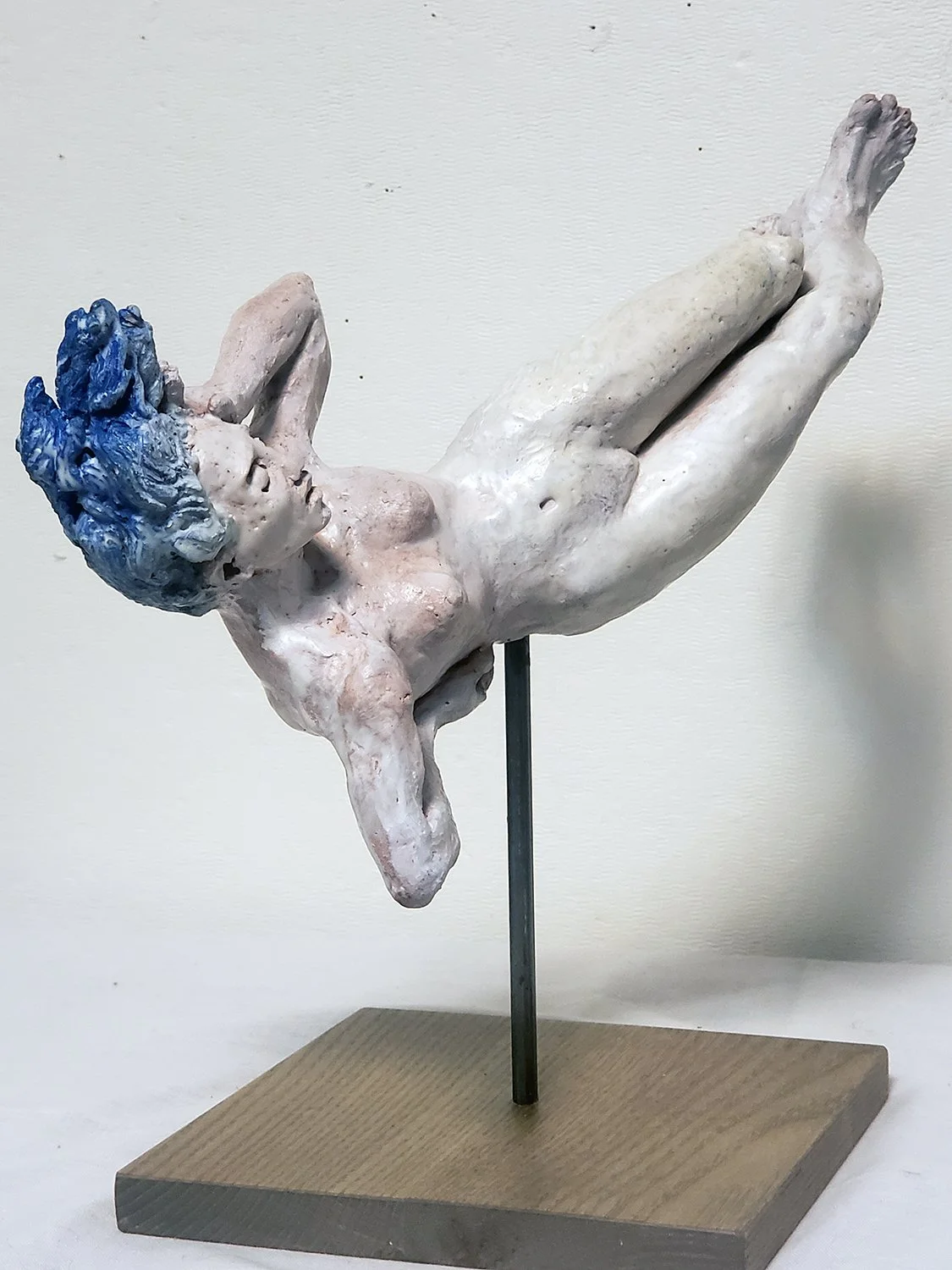 “In the metamorphic alchemy of clay, encaustic wax, and found materials, my work explores a diverse array of human mythologies, societies, and states of being.’’