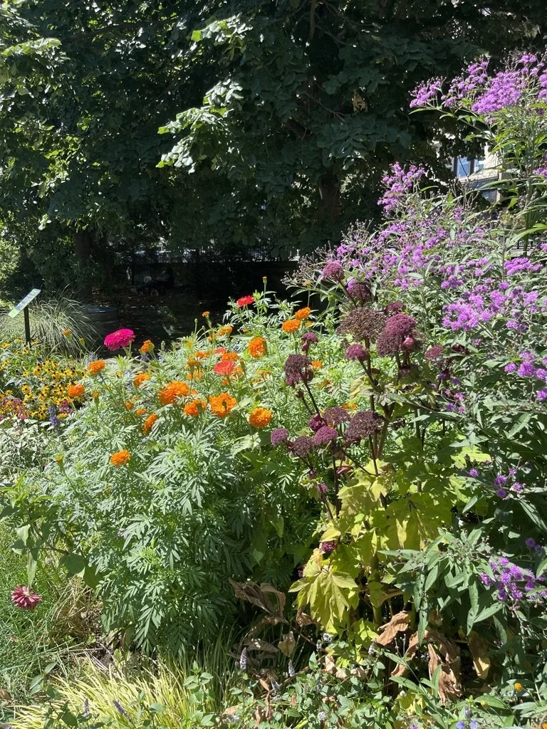 Tall Culver’s root shoots out white veronica-like spikes. Filipendula rubra blooms pink, but increasingly rusty-looking, flowers in the center of tall light-green foliage. In a raised bed, marigolds flower orange and yellow and lavenders purplish. Near the highway underpass wall, false and real sunflowers shine bright yellow. Sweet pea and honeysuckle vines flower vibrant pink and a bit of orange, and eggplant shows small dangling fruits along the wall to the tunnel.