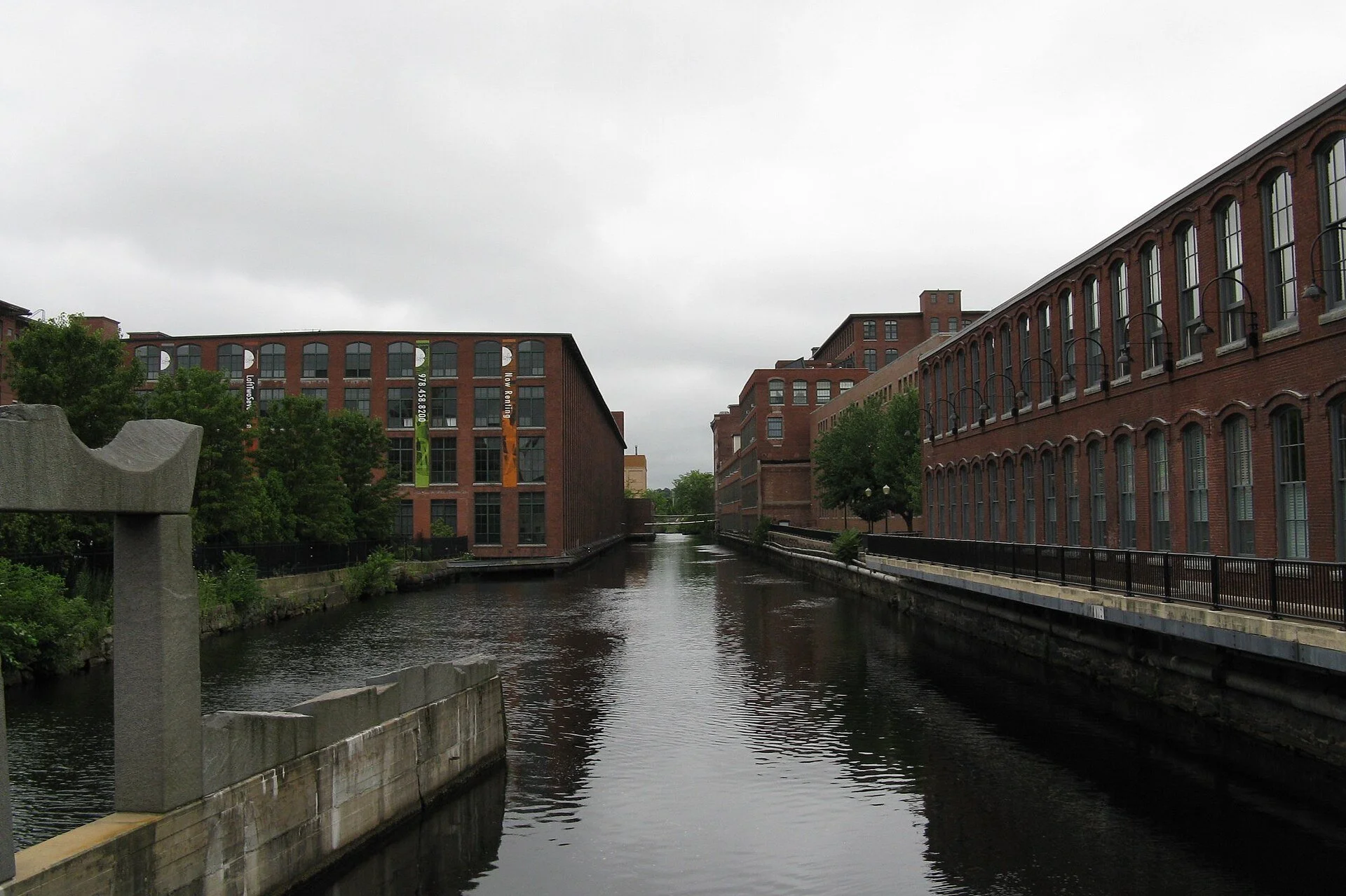 Pawtucket Canal at Central Street looking west, in Lowell. The 19th Century textile mills have been converted to other uses, if not torn down,