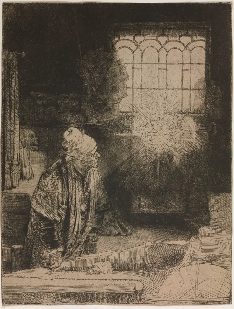 “A Scholar in His Study (Faust)” (1652) (etching, drypoint and engraving), by Rembrandt van Rijn, in the show “Global Crossings: Selections From the Lunder Collection,’’ at the Colby (College) Museum of Art, Waterville, Maine, Feb. 5-June 7.