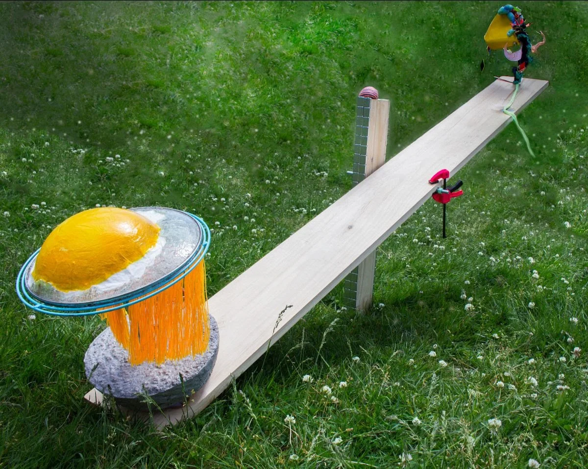 "Crack an Egg on your Head, Let the Yolk Drip Down, Seesaw" (flocking, resin, wood, metal, and mixed media), by Greater Boston-based artist Meagan Hepp, in her show “Play Date: Companions Club, at Kingston Gallery, Boston, through Oct 2.