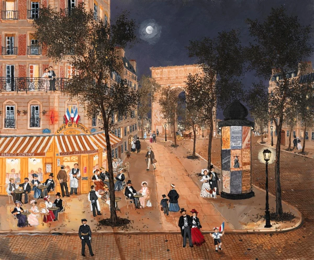"Until recently, Fabienne was known mainly for her seascapes and pastoral landscapes while her father was renowned for his Parisian cityscapes. However, now, Fabienne has expanded her lists of subjects to include the streets of Paris. Like her father’s, Fabienne’s Paris is an older, simpler one with horse-drawn carriages filling the streets."