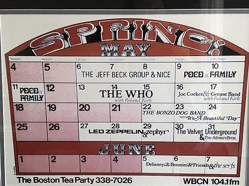 The May 1969 concert schedule for the Boston venue The Boston Tea Party displaying acts such as Led Zeppelin, the Velvet Underground and the Who.