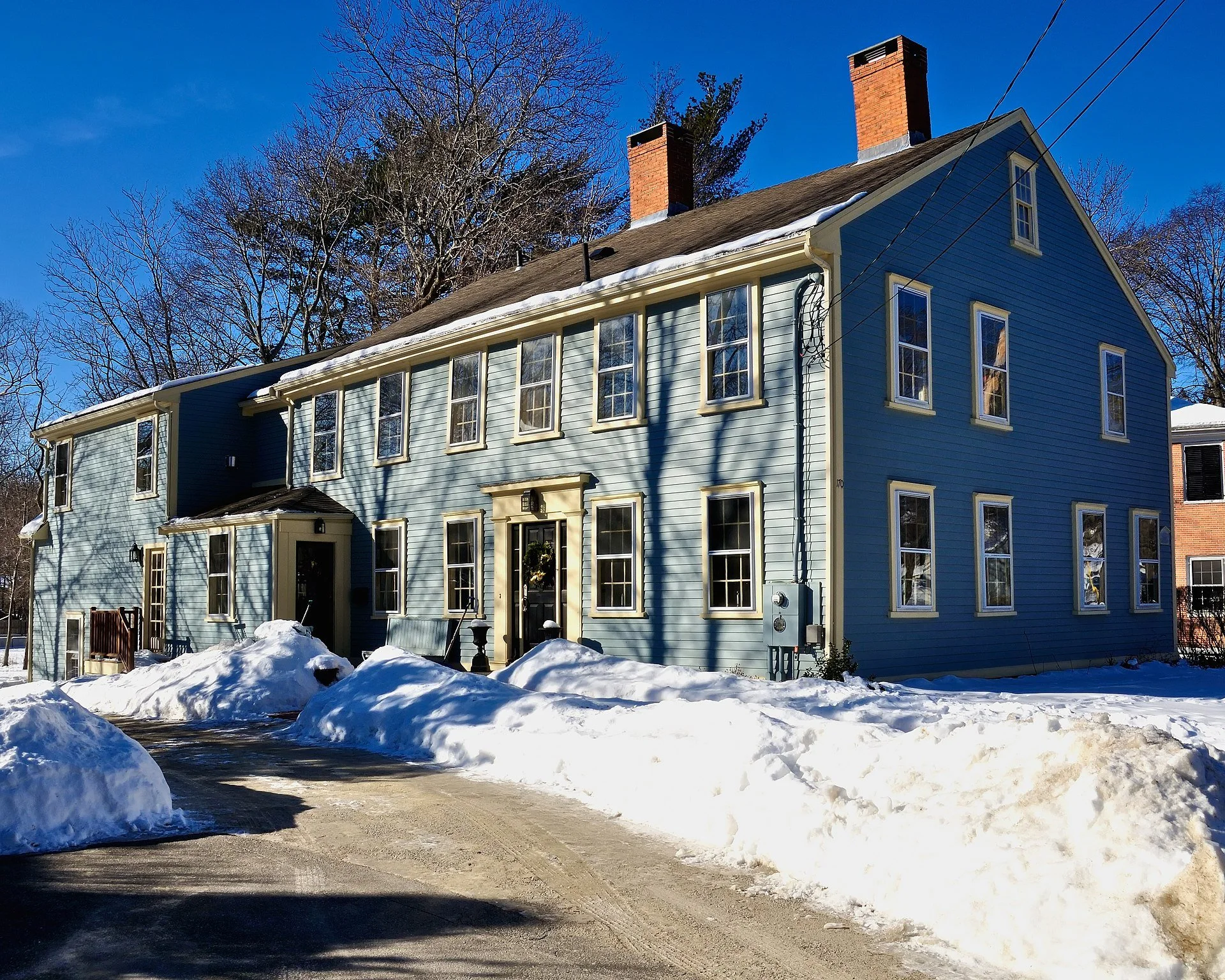 Few or no opulent men, no poor. Great similitude in their buildings, the general fashion of which is a chimney (always of brick or stone), and door in the middle, with a staircase fronting the latter; two flush stories with a very good show of sash and glass windows; the size generally from 30 to 50 feet in length, and from 20 to 30 in width, exclusive of back shed, which seems to be added as the family increases.’’