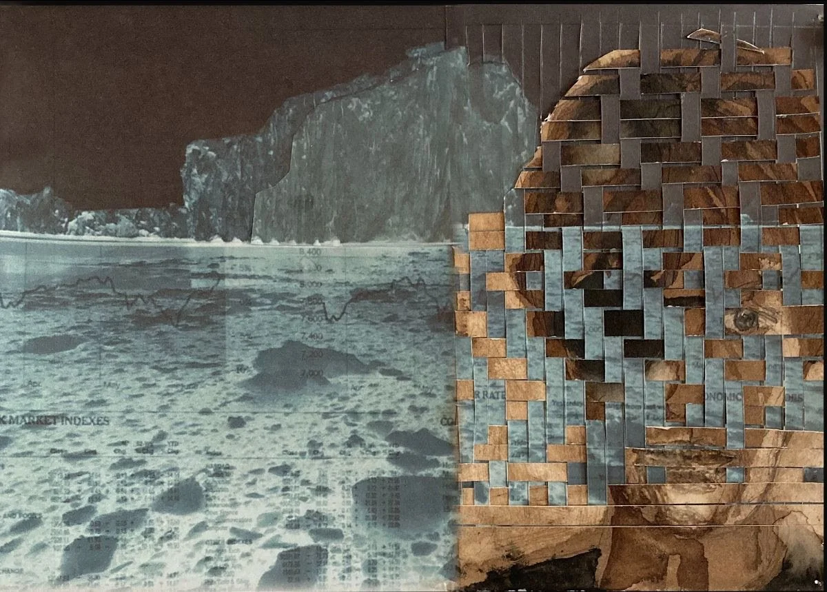The gallery says: “‘Splinter’ is an intimate and probing array of self-portraits that create intricate matrices, interlacing her inner life with maps, charts, and images of an outer world undergoing constant change. While recovering from a rare brain tumor that initially rendered her unable to walk or see and prompted visual hallucinations, Driscoll began to draw herself in the starkest and most self-revealing manner. Over time, Driscoll began to interweave the self-portraits with images of melting glaciers, oil refineries, forest thickets, and birds, reflecting the artist’s long artistic preoccupation with global warming and environmental degradation. In each image, Driscoll’s face indelibly captures a vivid sense of a world and self, both intertwined and slipping away.”