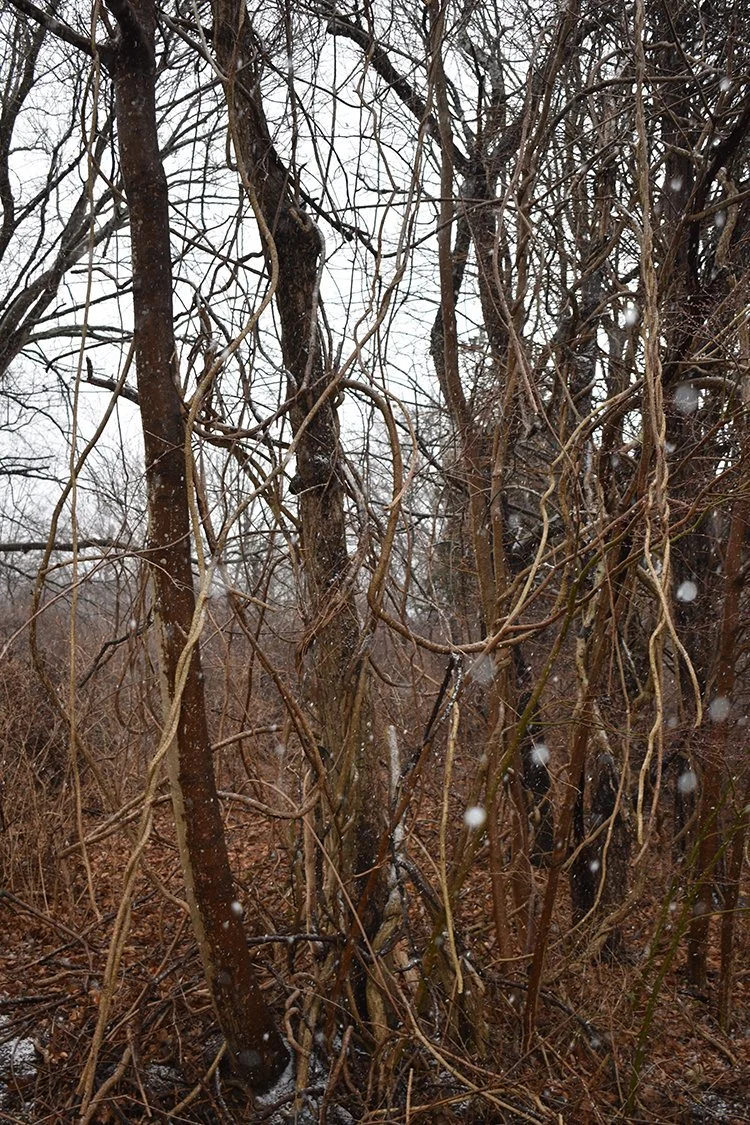 This snarl of oriental bittersweet has climbed into trees along a roadside in Portsmouth, R.I.