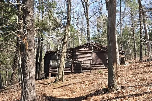 A cabin of the Ponkapoag Camp (established in 1921), of the Appalachian Mountain Club, on the eastern shore of Ponkapoag Pond in Randolph. The camp has 20 cabins, dispersed across a wooded area, that typically each sleep 4-6 people. No electricity or potable water is available at the camp; untreated water may be taken from the pond. In the summer the camp also makes available a few tent sites for camping. It’s near Great Blue Hill, at 635 feet, the highest point in Greater Boston.