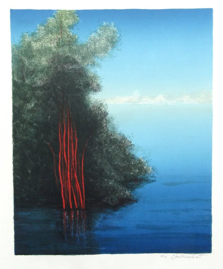 “Sheltered’’ (lithograph), by Somerville, Mass.-based artist Carolyn Muskat, in her lithograph show “Moving Forward, Looking Back,’’ at Nesto Gallery, Milton, Mass., through April 6.