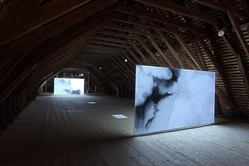 "Smoke'' (installation view, two-channel video, looped), by LISA OPPENHEIM, in the "Film as Medium and Metaphor'' show at the Massachusetts Museum of Contemporary Art, North Adams, Mass.