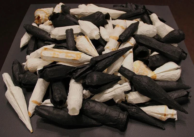 His show features large paper sculptures that act as monuments and reminders of past objects, people and actions. The gallery says: "Influenced by the concept that traits and traumas can be imprinted on our DNA and passed down to future generations, Adamites's work embraces the physical and psychic state of repetition. Dowsing pendulums, disfigured orbs and husk-like forms are common visual themes employed by the artist to highlight the state of disorder at the point when memories become new experiences, and the familiar becomes foreign. ''