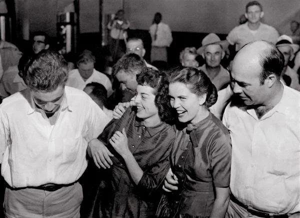 Photo from the show "Black & Brown People/ White Problems,'' at the Samson Projects gallery, Boston, through Aug, 19. In this picture, from left to right: Roy Bryant, Carolyn Bryant, Juanita Milam, and J. W. Milam embrace after the men's acquittal by an all-white male jury of the charge of having kidnapped, beaten and murdered Emmett Till, a 14 year-old black boy in 1955 – a crime that the two men confessed to in an interview in 1956, paid for by Look magazine, and in which they showed no remorse. Photo by Associated Press; individual photographer not identified.