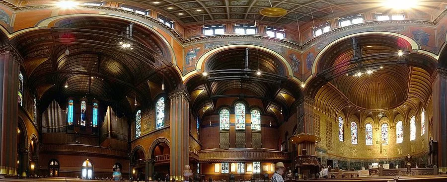 Panorama of the inside of Trinity Church, Boston, built in 1872-77. The shadows from new nearby towers threaten to sometimes reduce the beauty of the stained glass windows.