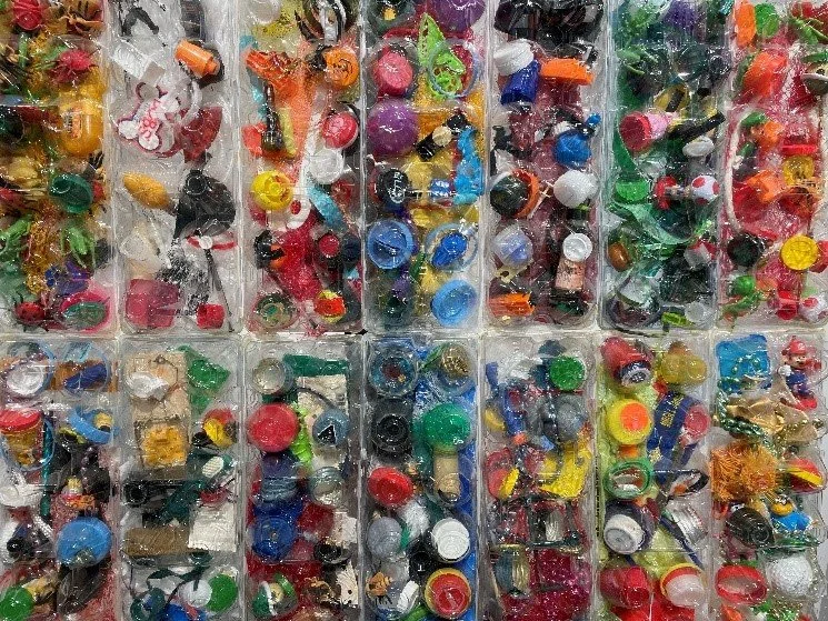 Work by painter/experimental artist Sinikka Nogelo, who has created art based on abstractions of such environmental challenges as the atmosphere’s ozone hole, oil spills and melting polar ice. The discovery of gyres of plastic in the oceans spurred her to three-dimensional action with her series of wall pieces made out of plastic. This piece can be seen at the Cape Ann Museum’s White-Ellery House, in Gloucester, Mass.