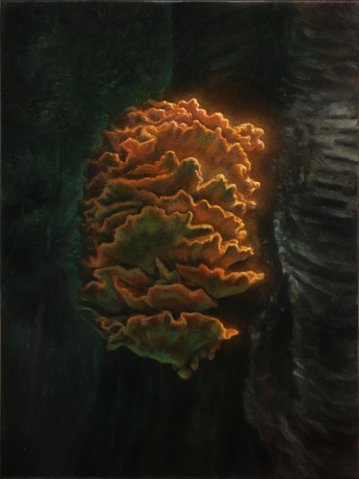 “Sulphur Shelf” (oil on canvas), by Owen Krzyzaniak Geary, a New York-based painter, in his show “Night Vision,’’ at Two Villages Art Society, in the Hopkinton, N.H., village of Contoocook (his hometown), through June 18.