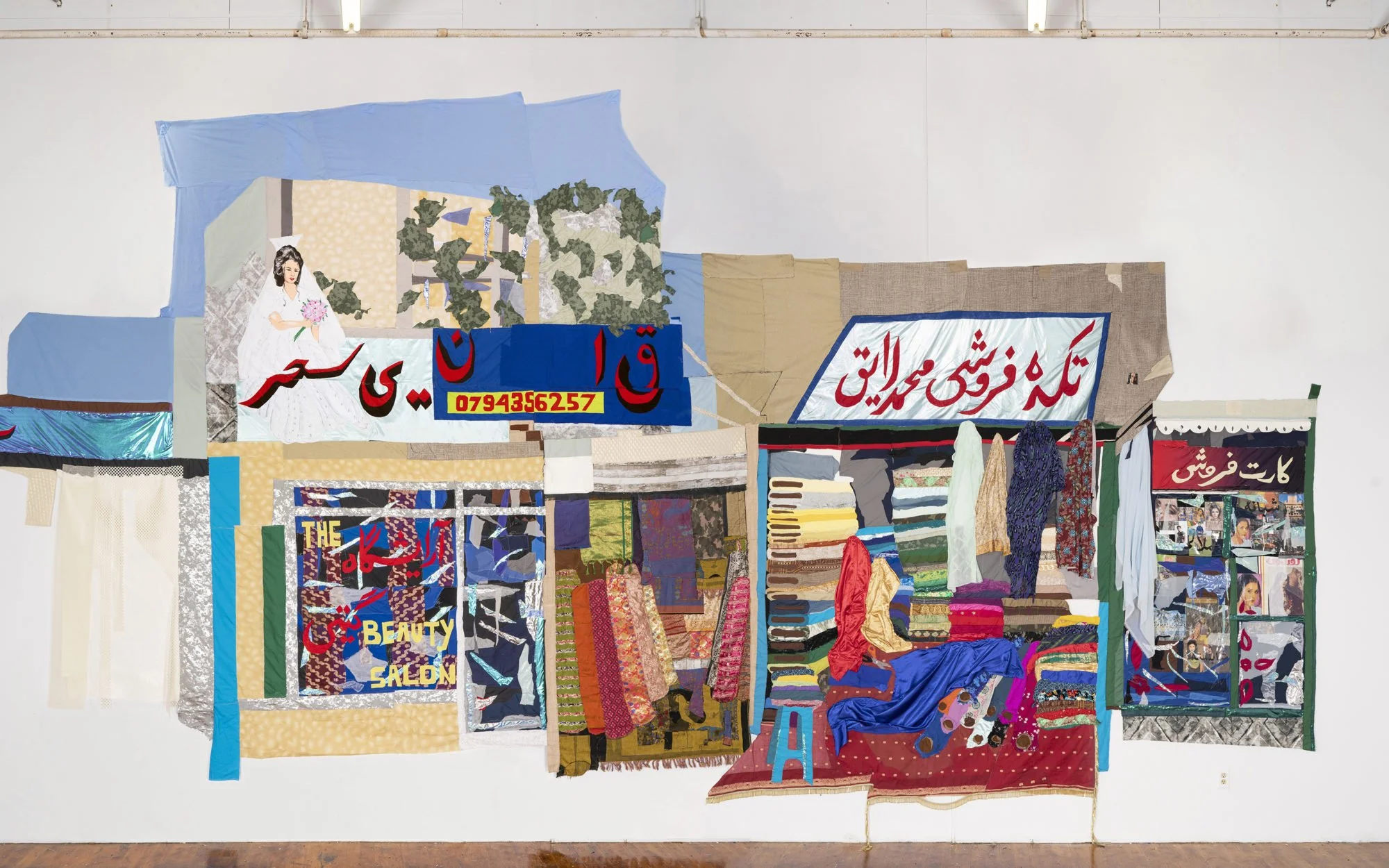“Afghan Canadian artist Hangama Amiri combines painting and printmaking techniques with textiles, weaving together stories based on memories of her homeland and her diasporic experience. She fled Kabul with her family in 1996 when she was 7.’’