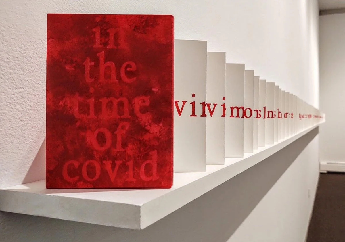 “Much like everyone else, I was consumed by the news. I read and listened to anything that might inform me. The language, and its daily repetition, took hold. I made lists of phrases and words. I organized and edited them, focusing primarily on the language and events of the first three months of the pandemic. The use of a long accordion book provided both a means of including the extensive text while also emphasizing the length of the pandemic.”