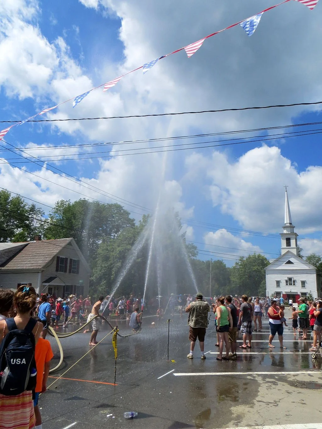 Start of a game of water polo on Main Street in Saxtons River, after the Fourth of July parade in 2013. Volunteer firefighters try to spray the ball down the street to a goal. Looking west at the Saxtons River Historical Society (a former Congregational church).