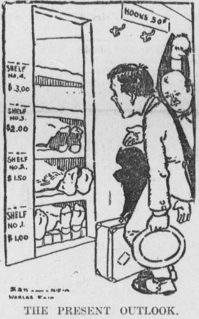 1904 cartoon warning attendees of the St. Louis World's Fair of hotel room price gouging.
