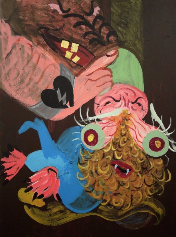 Work by Rhode Island-based painter Kim Salinas Silva in show "Stop Me!,'' at Periphery Space gallery, Pawtucket, R.I,, through Aug. 12. She says her work is "profoundly influenced'' by the writings of Cart Jung, the Swiss psychologist and Freud rival. "His view that humankind cannot be healthy until we embrace our shadow, or the darker, more unruly parts of ourselves, has become crucial to my work.''