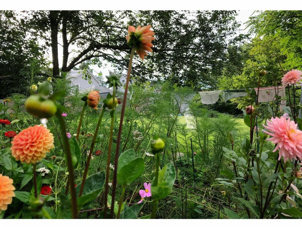 Through the dahlias, backyard, Auburndale’’ (archival digital print), by Mary Lang, in her show “Farandnear,’’ at Kingston Gallery, Boston, June 1-26. She lives in Auburndale, part of Newton.