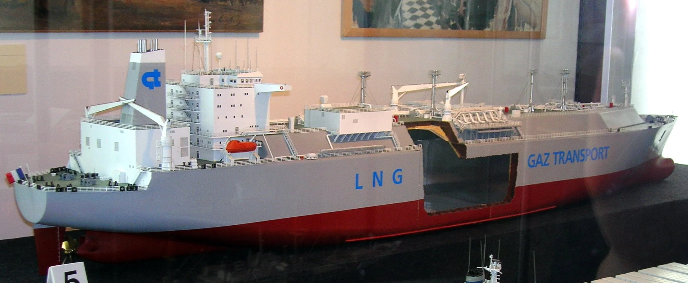 Model of the LNG tanker Rivers. It was built in 2002 and is registered in Bermuda. Its capacity is 137,500 cubic meters of gas.