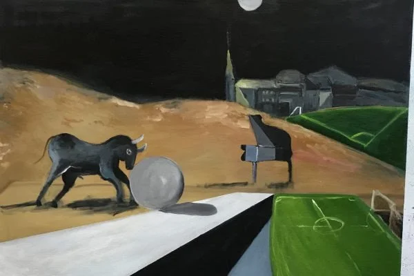 “For the viewer, the stories within the compositions are open-ended and puzzling, being directed in possibility by the depicted visual objects and glimpses of human form. We approach these compositions by asking what’s going on. Some paintings depict relatable imagery such as domestic interiors, landscapes and active scenes, while others are expressive and fantastical with abstracted and speculative shapes and figures.’’