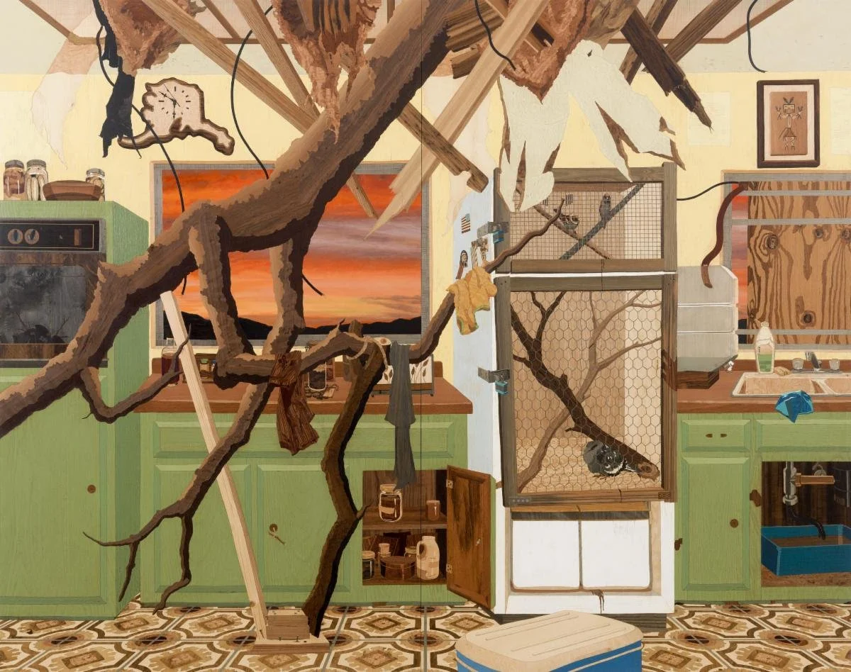 “The Kitchen” ( marquetry hybrid: wood veneer, oil, acrylic and shellac), by Allison Elizabeth Taylor, in her show “The Sum of It,’’ though July 30, at the Addison Gallery of American Art, Andover, Mass.