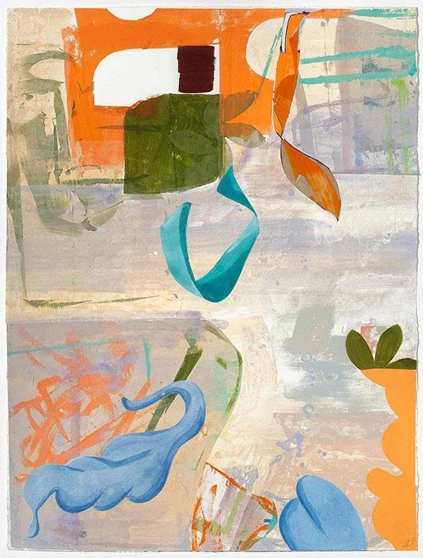 “Collage is a process of piecing together papers. When I began with the collages in this show, I gathered painted papers for a background. Then I would hunt for shapes to go into the backgrounds. Often the work got too busy, and then I’d try to simplify it by reintroducing backgrounds. This led to shifting surfaces and a back and forth feel which felt good to me.