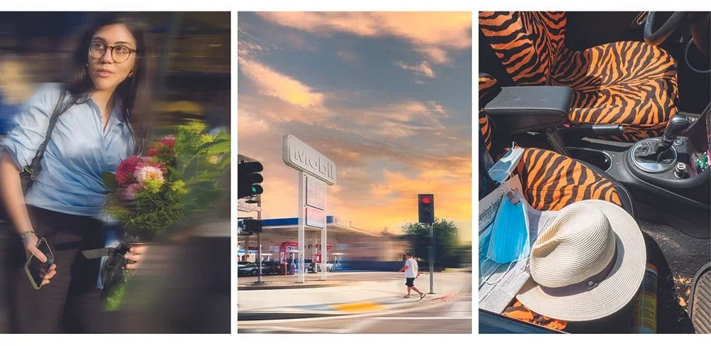 “A woman cradles flowers on a city street. Sunset sweeps across an LA intersection. A Panama hat and tiger-striped seat covers suggest a safari in Provincetown.