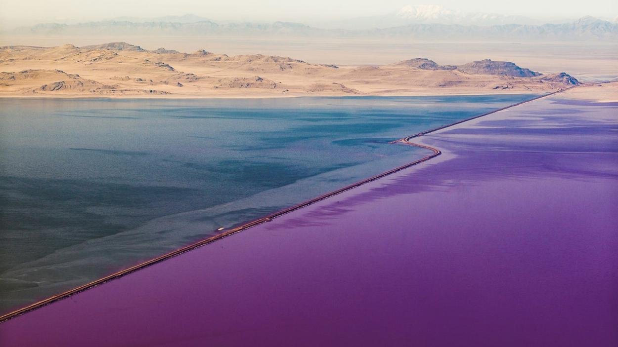 “The south arm has more fresh water flowing into it from the mountains than the north arm. The salinity of the north arm is currently 34%. The current salinity for the south arm is 11.2%. For reference oceans are 3% salinity. The color of the north arm changes by season with the growth of archaea as seen in some of the other images in this exhibit. Note the archaea (pink) seeping into the south arm along the causeway.’’