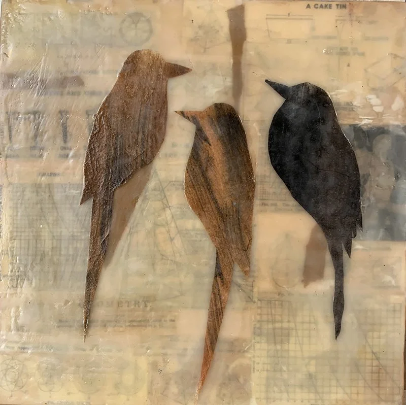 “I achieve this using encaustic medium and paint, photography, textiles, Japanese papers, and found objects to make harmony of my world and communicate thoughts and emotions.