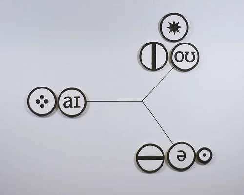 The gallery says "just as atoms are the building blocks of matter, Hulsey constructs names of chemical elements from their phonemes, the building blocks of speed.''