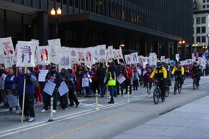 Chicago teachers marching during a demonstration on Oct. 14, 2019
